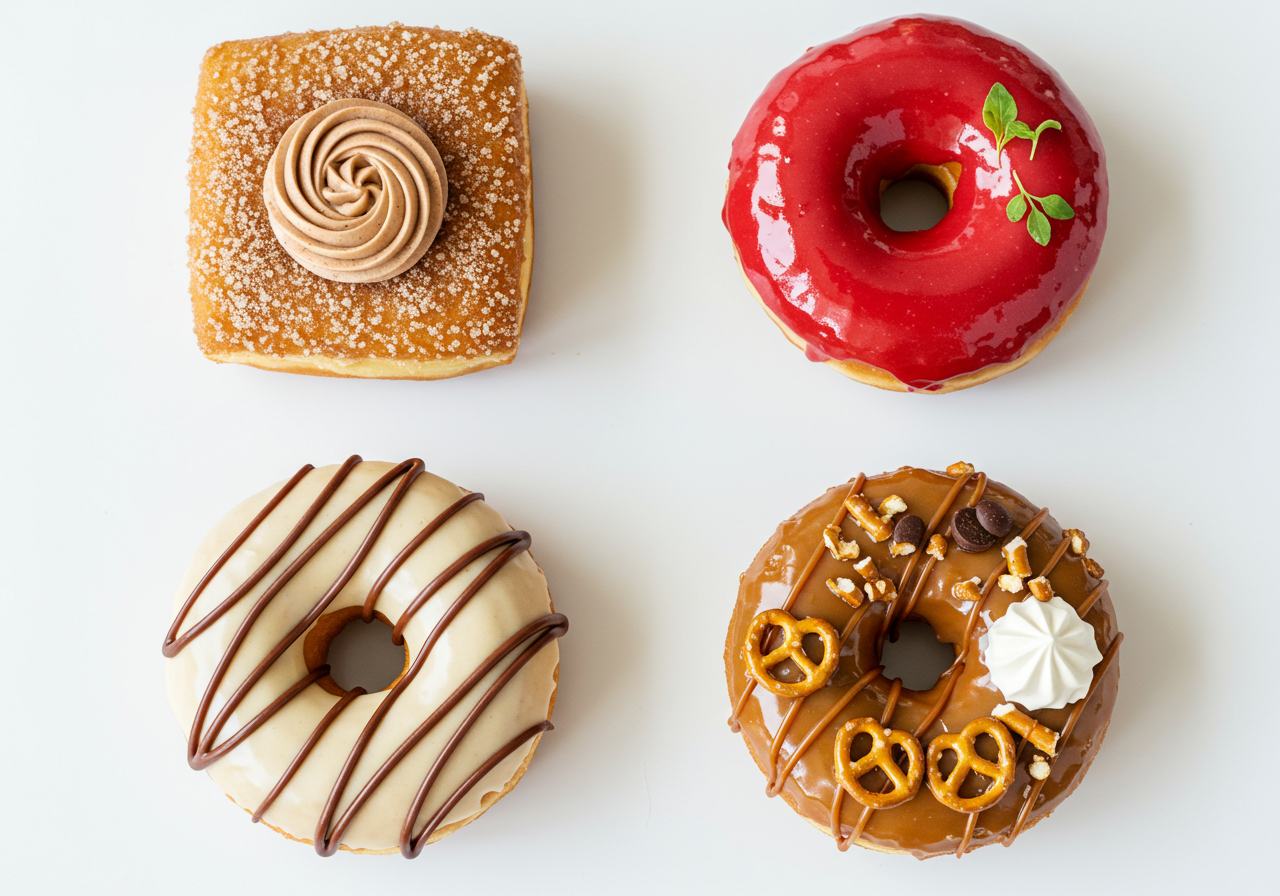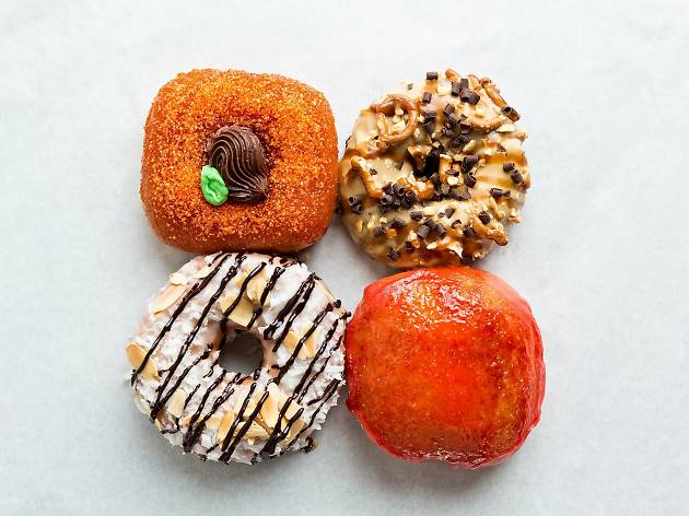 Specialty doughnuts like Candy Apple, Candy Bar, and Pumpkin Pie, the latter of which is filled with pumpkin pastry cream, covered with pumpkin-spice glaze and dusted with orange sugar, all topped with vanilla buttercream in the shape of a pumpkin stem and leaves.