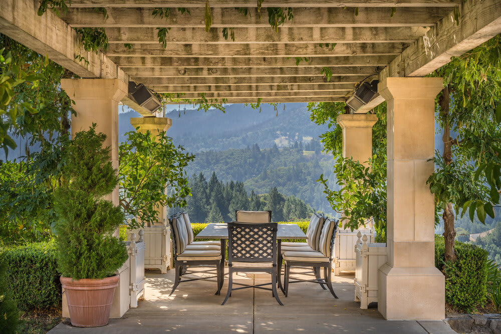 The gardens overflow with lovely entertaining environments, including several covered dining areas; a pool, spa, and deck overlooking iconic wine county views; and a shady mature olive grove.