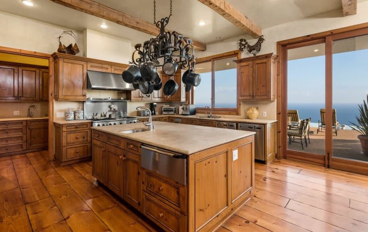 This large entertaining kitchen is both warm and inviting with wide-plank wooden floors and exposed wooden beams overhead that extend all the way to the adjacent dining area and living room. Also spanning the entirety of the space is a succession of sliding doors that invites one to enjoy the ocean scenery whether inside or outside on the sprawling deck.