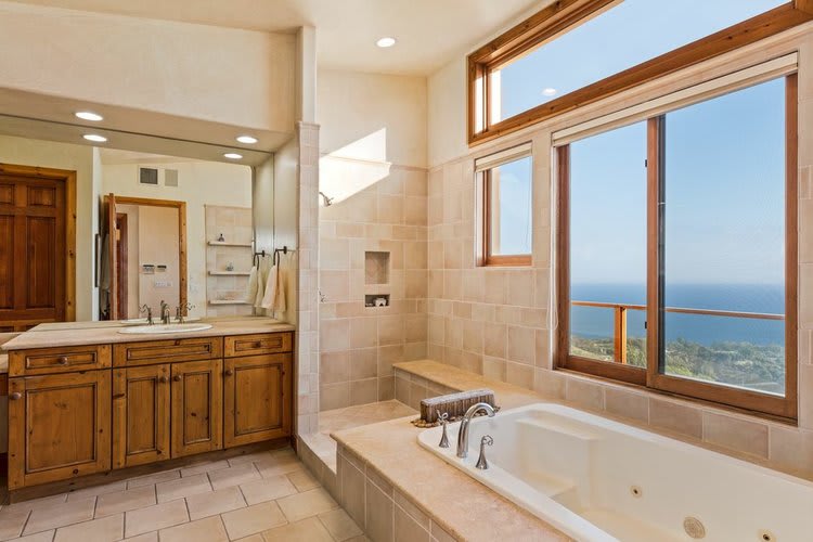 Mimicking the composition of the master bedroom, this master bath is designed to bathe the interior spaces in light and showcase the extraordinary mountain, sea and sky views.