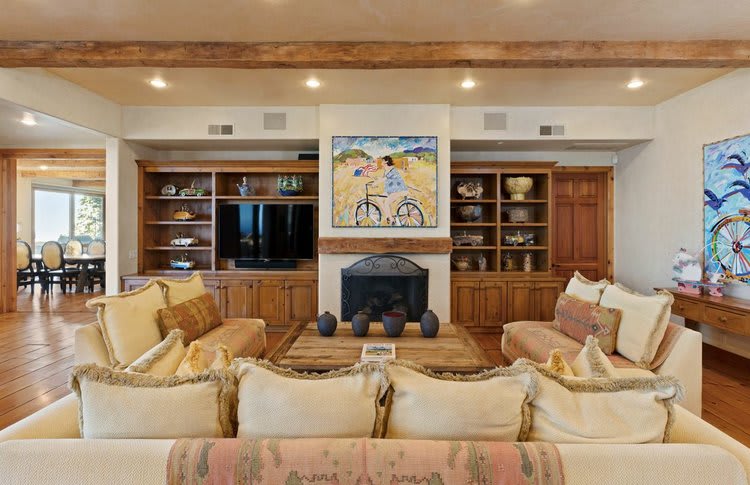 As one steps down from the main foyer, they are greeted by this central gathering space that features built-in shelving and cabinetry, exposed beams and ample seating. The nearby kitchen leads into this space while doors located along the side of the room lead out onto the outdoor deck.