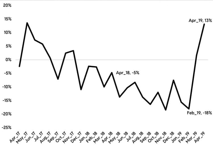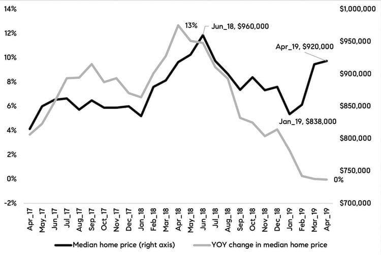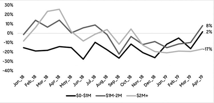 After doldrum housing market activity in Los Angeles through the first quarter of 2019, April has finally brought some cheer. Number of homes sold compared to last year increased 1 percent overall, mostly driven by increases in sales of homes priced between $1 and $2 million (up 8 percent), and sales of homes priced below $1 million (up 2 percent). Higher priced homes (above $2 million) continue to trend below last year’s levels, but are still ahead compared to 2017 and 2016. 2018 saw a surge in higher-priced sales activity. Figure 1 illustrates trends in year-over-year changes of the number of homes sold by price range. Encouragingly, sales of homes priced below $2 million saw growth after an extended period of double-digit declines, especially among homes priced below $1 million which have been on a decline since July 2017.